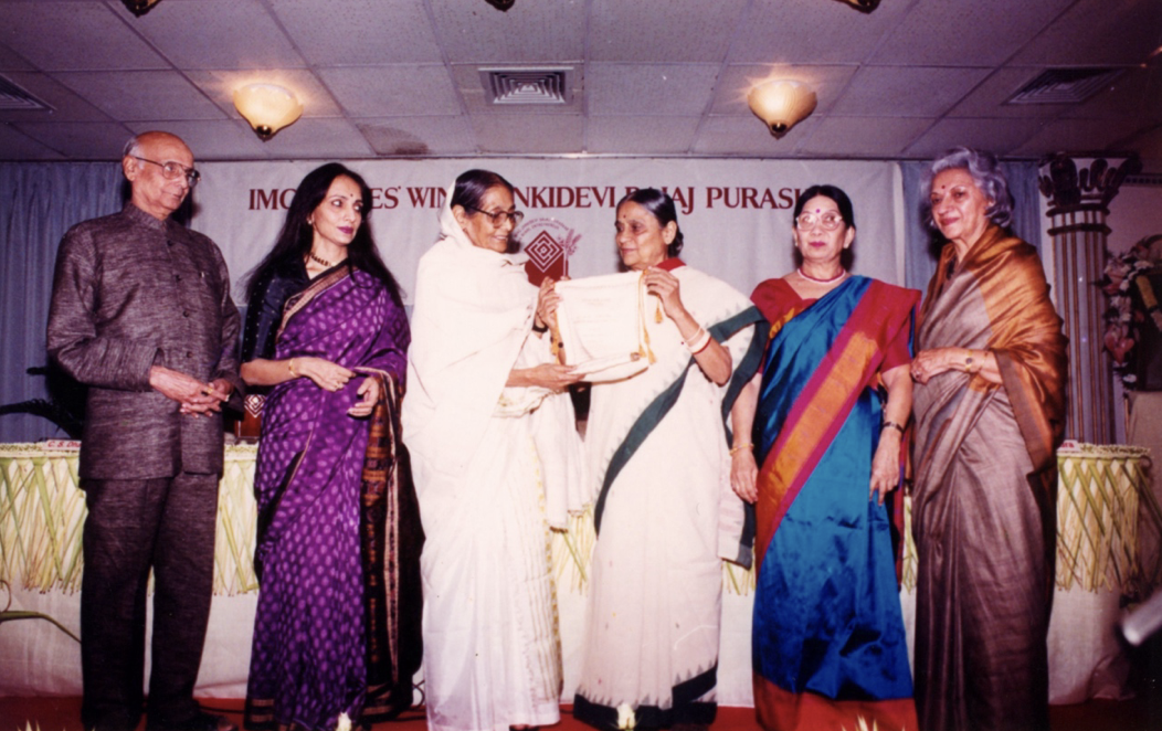 पुरस्कार वितरण समारोह : (बाएँ से दाएँ) श्रीमती अमृता सोमैया (अध्यक्ष – आई.एम.सी. लेडीज़ विंग), सुश्री दिया मिर्ज़ा (प्रसिद्ध अभिनेत्री एवं पर्यावरणविद्; मुख्य अतिथि), श्रीमती राजीबेन वनकर (ब्रांड ‘राजीबेन’ की संस्थापक; पुरस्कार प्राप्तकर्ता), श्री अशोक खोसला (संस्थापक - डेवलपमेंट आल्टरनेटिव्स ; विशिष्ट अतिथि) और श्रीमती राधिका नाथ (अध्यक्ष - 30वां जानकीदेवी बजाज पुरस्कार समिति)